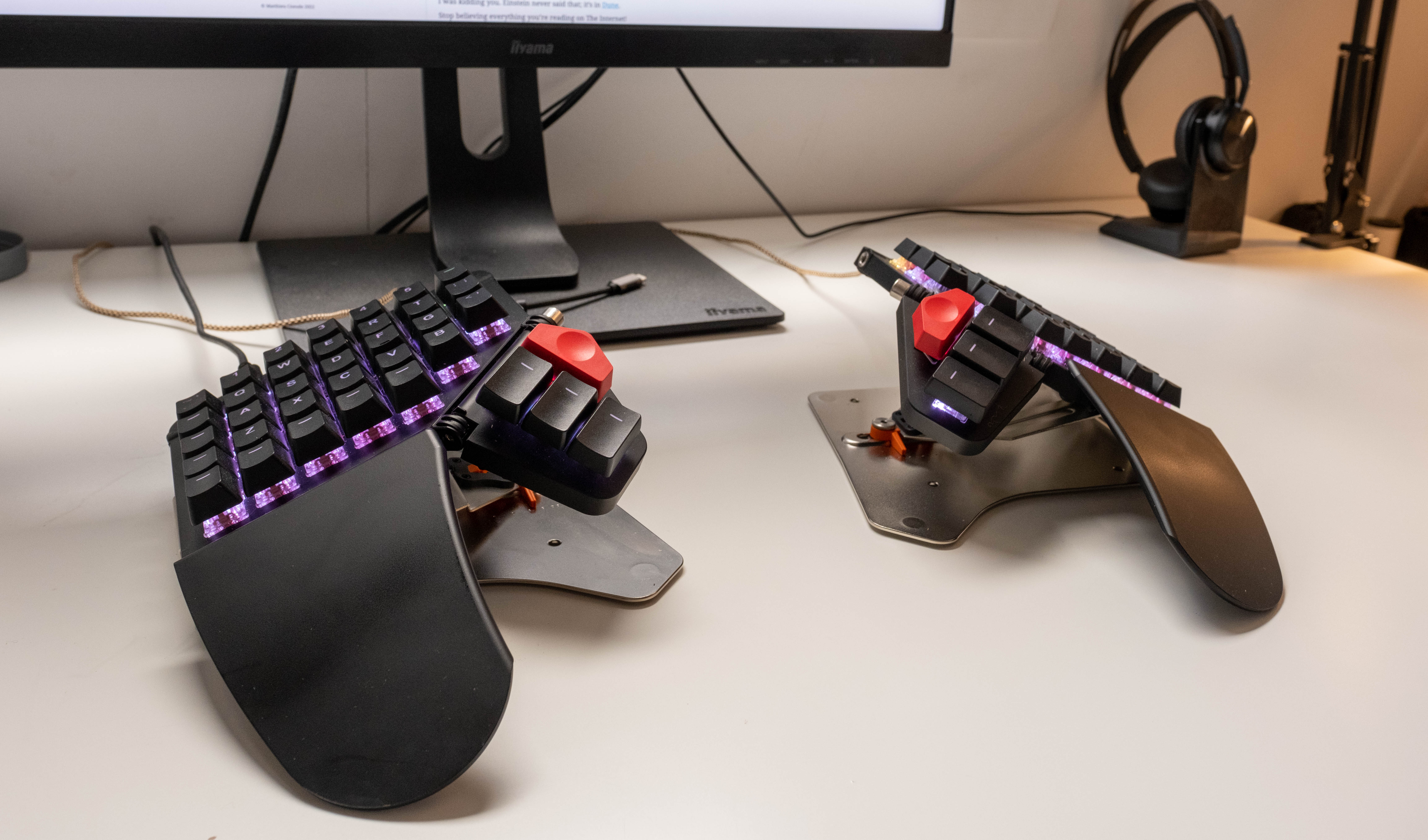 In April 2022 I bought the ZSA Moonlander. It's a customizable split mechanical keyboard, and each half can be tilted.